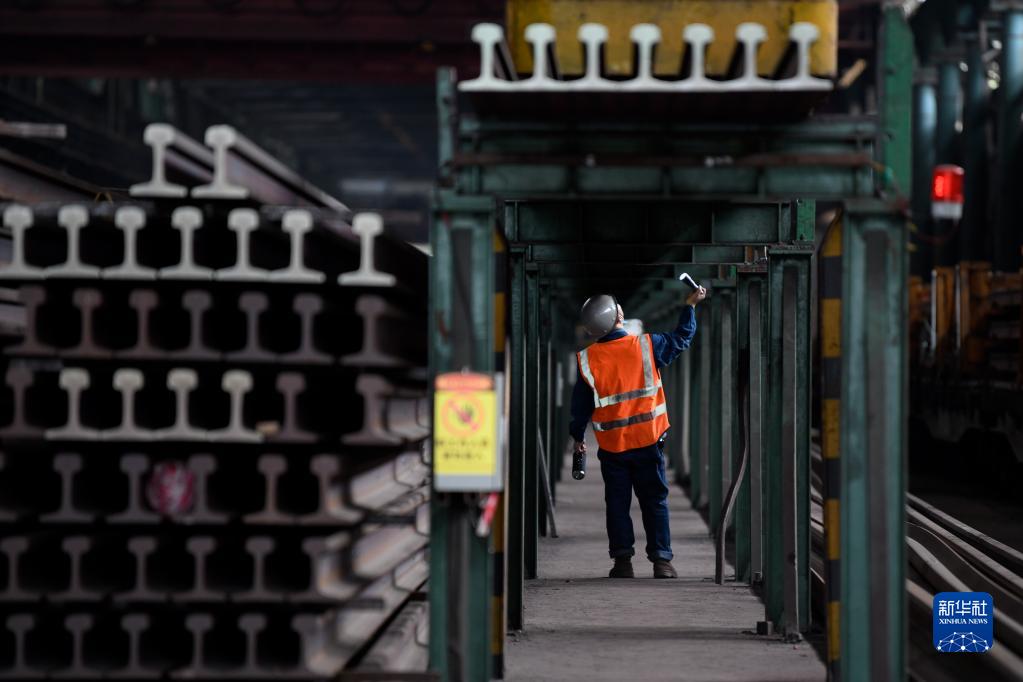 在攀钢钒轨梁厂,工人对等待装车的百米钢轨进行轨底检测(2月24日摄)。