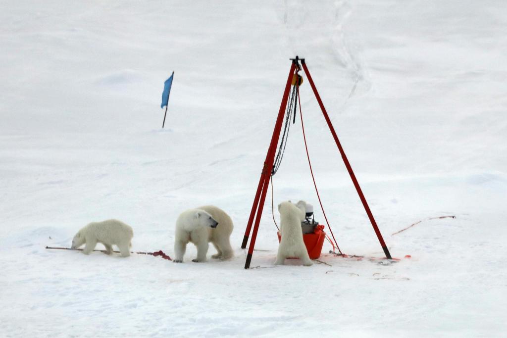 北极熊一家三口来到考察队尚未完成布放的冰基浮标处。新华社记者刘诗平 摄