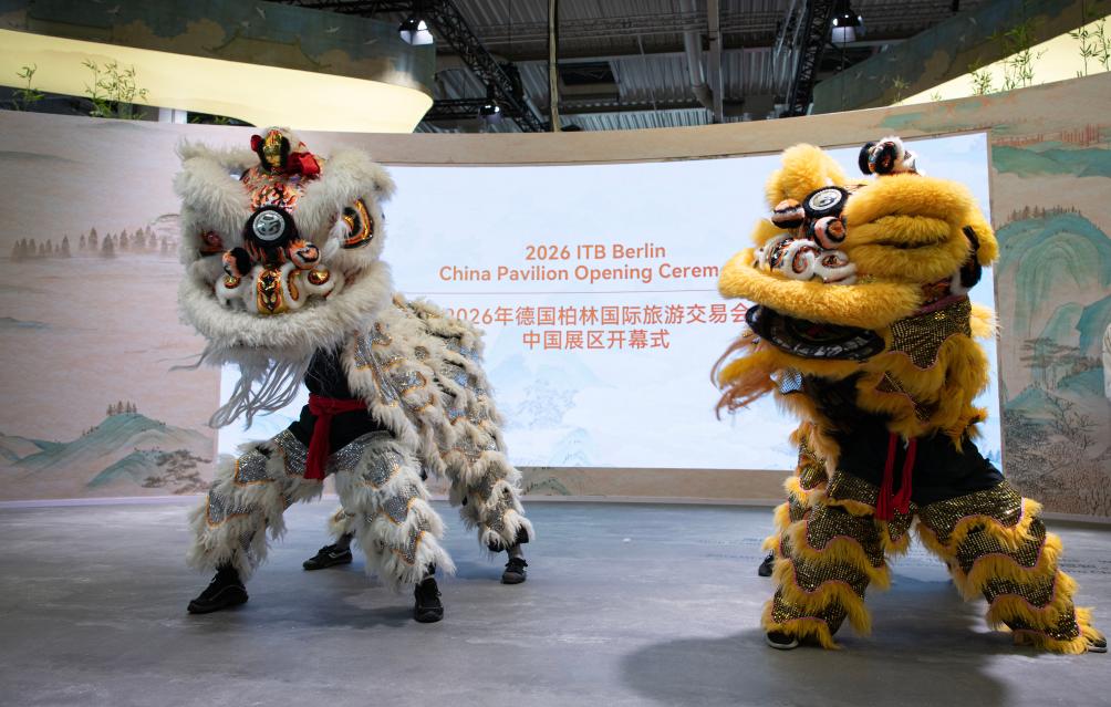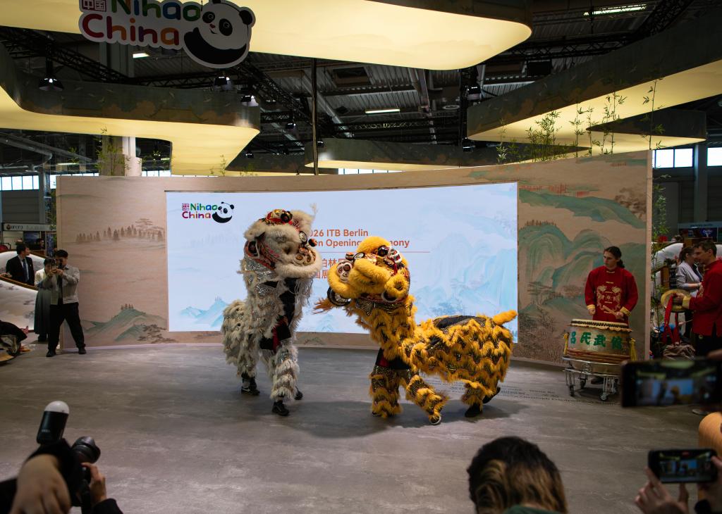 3月3日,在德国首都柏林,演员在2026柏林国际旅游交易会中国展区表演舞狮。新华社记者 张豪夫 摄