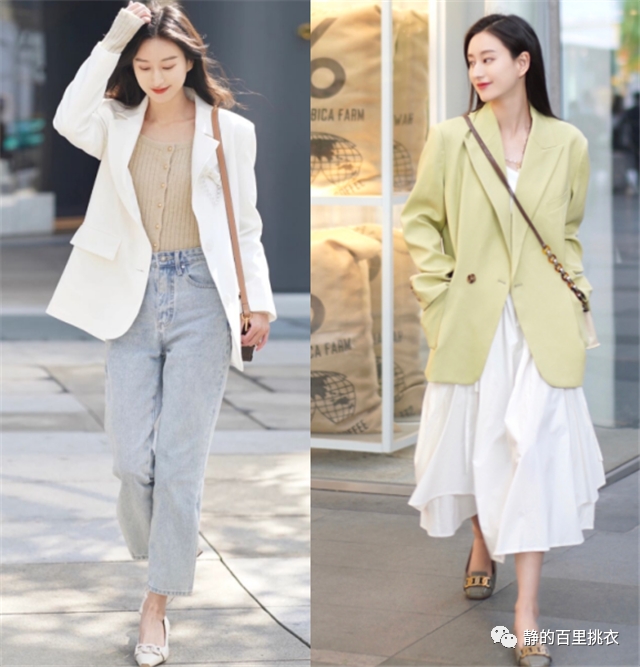 春天挑选外套的时候,多给自己入手浅色单品吧,这些浅色系看上去会更清爽一些,比如下面的白色西装或者是绿色西装都是很显白的,相比普通的黑色更能减龄哦。