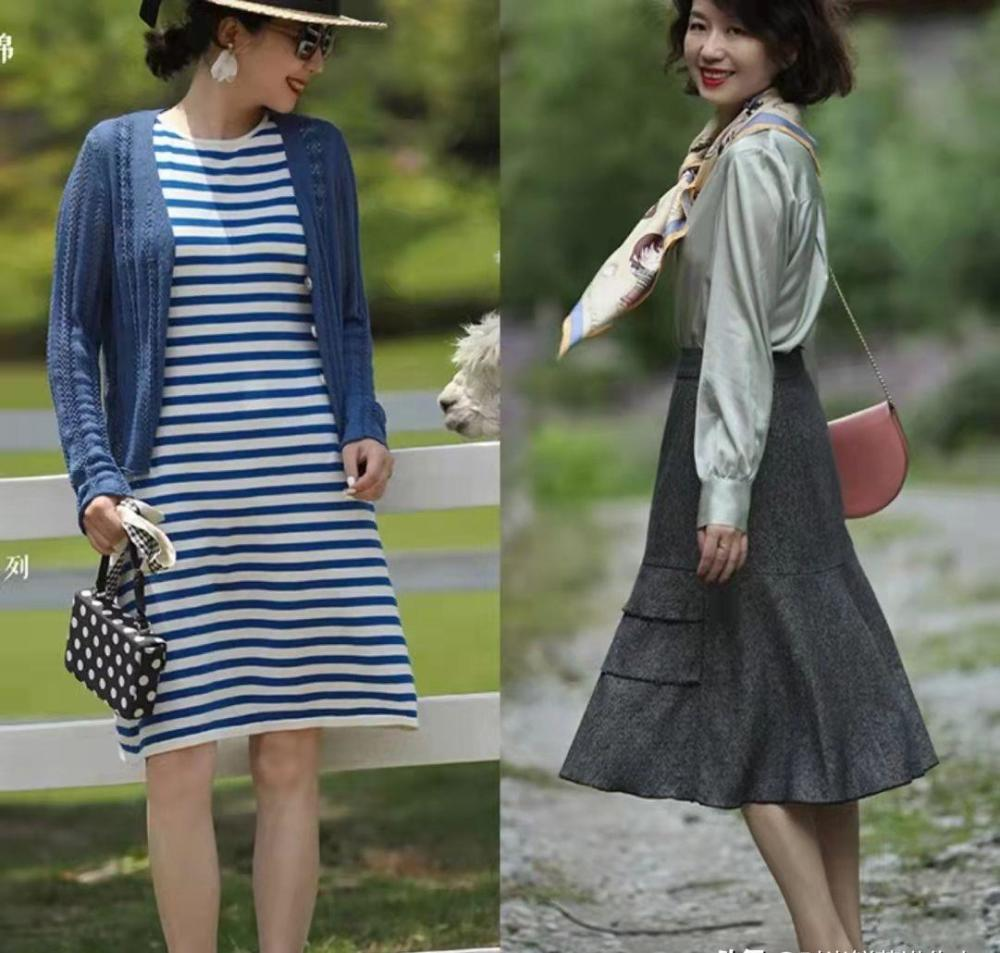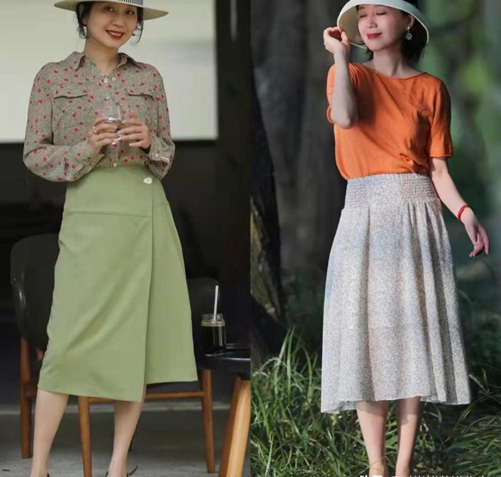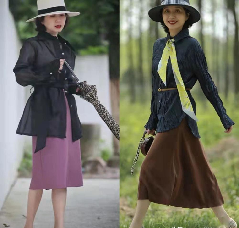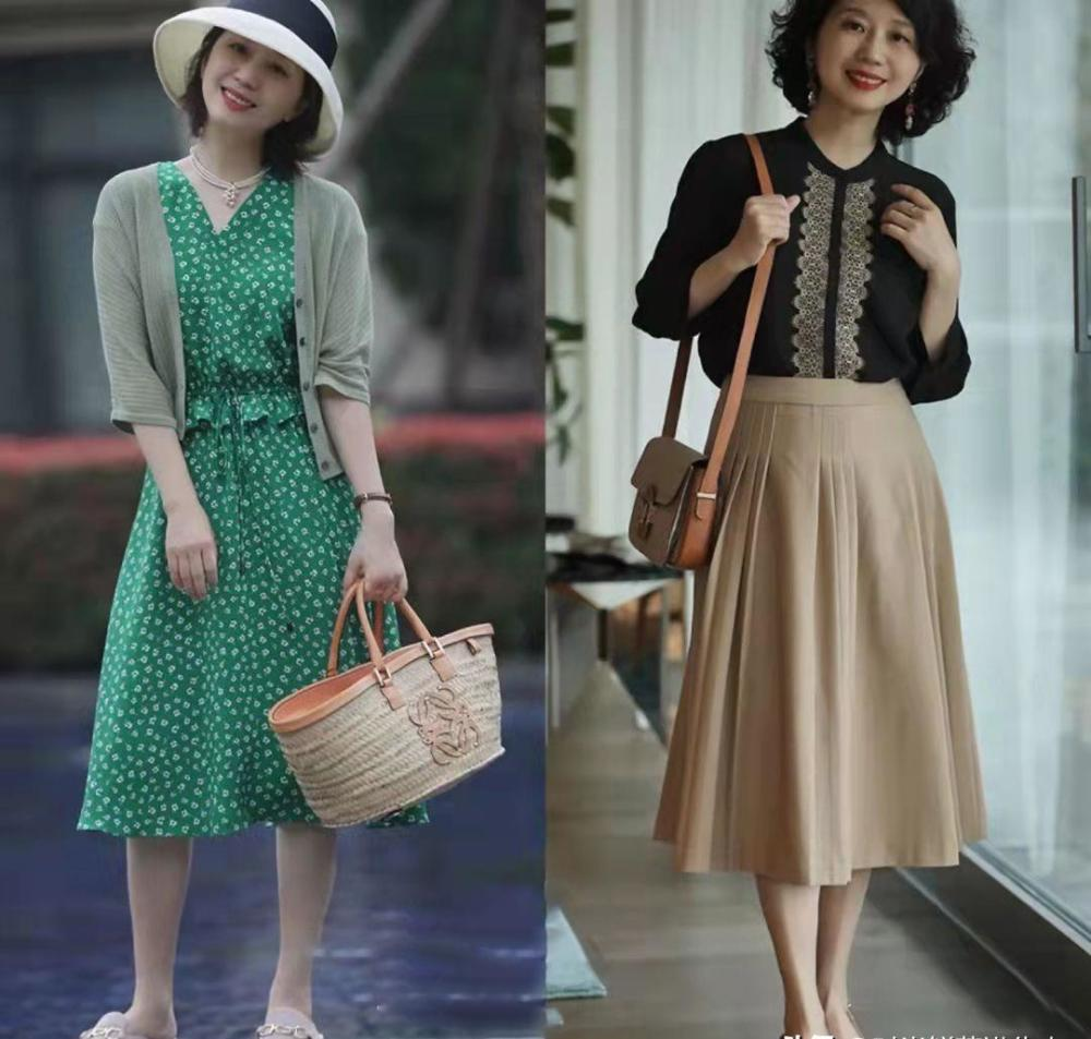 我们能够看出,左图这款绿色碎花裙很抢眼,无论是颜色还是设计都比较时髦独特,这类服饰中年女人驾驭还是有一定的难度的。相比而言,右图的这款黑色花纹衬衫与卡其色伞裙的造型就明显高级许多,配色虽然并不复杂华丽,却比较符合中年女人的年龄以及气度,呈现出的造型美是高级且耐看的。