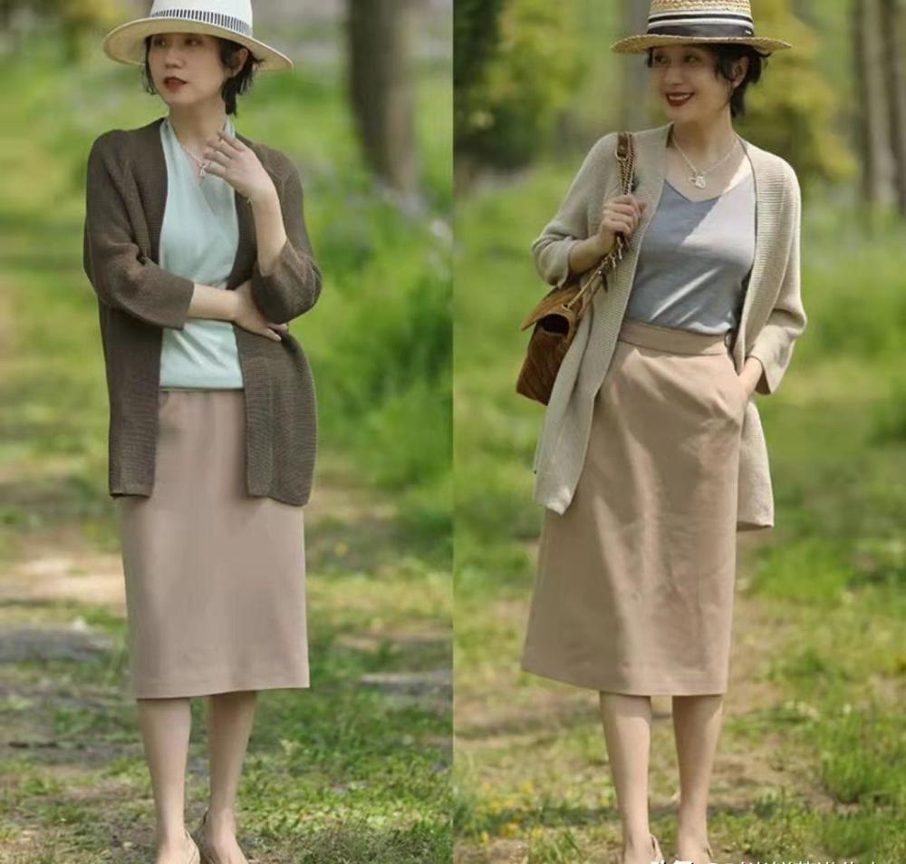 中年女人无论选择什么样的服饰,都要以廓形宽松的衣服为主,这样的服饰与紧身的衣服不同,往往更能弥补我们身材上的不足,为我们带来穿衣舒适又显瘦的穿搭效果。这款棕色的开衫搭配浅卡其色直筒裙的造型温柔知性,其中棕色开衫版型线条设计流畅,能够完美匀称中年女人全身的身材比例,看起来和谐灵动、大气得体。