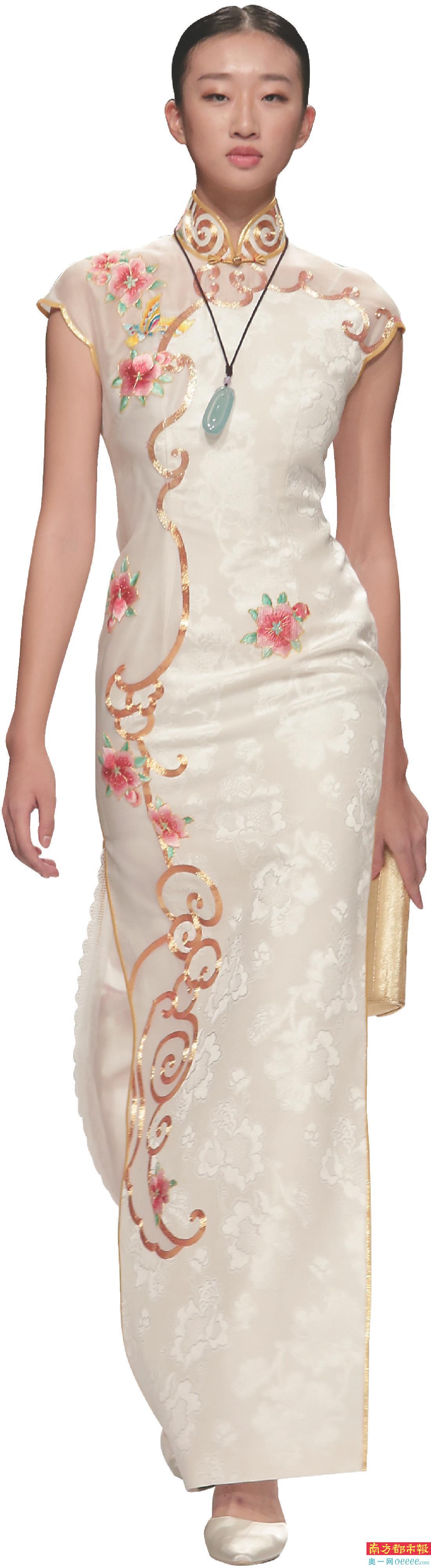屈汀南介绍,这个系列共有12件服装,都是“重工刺绣”精品,采用重磅丝绸,丝绸质感细腻并具有独特的光泽感。技法方面也尤为“隆重”,以盘金绣和传统广绣技法的结合,运用在高级的丝绸上,色彩相宜,高贵雅致。在服饰上还以各种珠饰搭配,使整个系列熠熠生辉。图案设计上运用了各种象征吉祥如意、富贵满堂的中国传统符号,充满美好寓意。