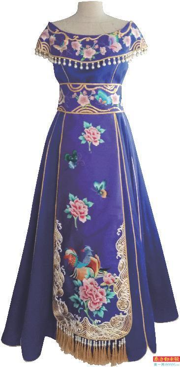 设计师点评 “紫罗兰盘金绣改良礼服”:传统广绣融合礼服裁剪,紫罗兰色重磅丝绸配盘金海水纹,精美广绣牡丹海棠,富贵满堂,鸳鸯双栖蝶双飞,金穗流苏摇曳生姿。