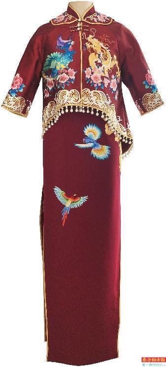 “品红镶珠龙凤滚金边华裳”:参考了婚褂裁剪融合传统真金镶边手工,以纯金盘钉海水波浪纹,前襟绣龙凤呈祥,又以海棠承托。