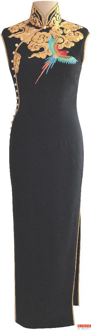 “黑鹤羽盘金绣祥云纹滚金边旗袍”:融合现代立体裁剪与传统真金滚边手工,黑色的衣料衬托着金线绣成的祥云,五彩鹦鹉振翅高飞,栩栩如生。