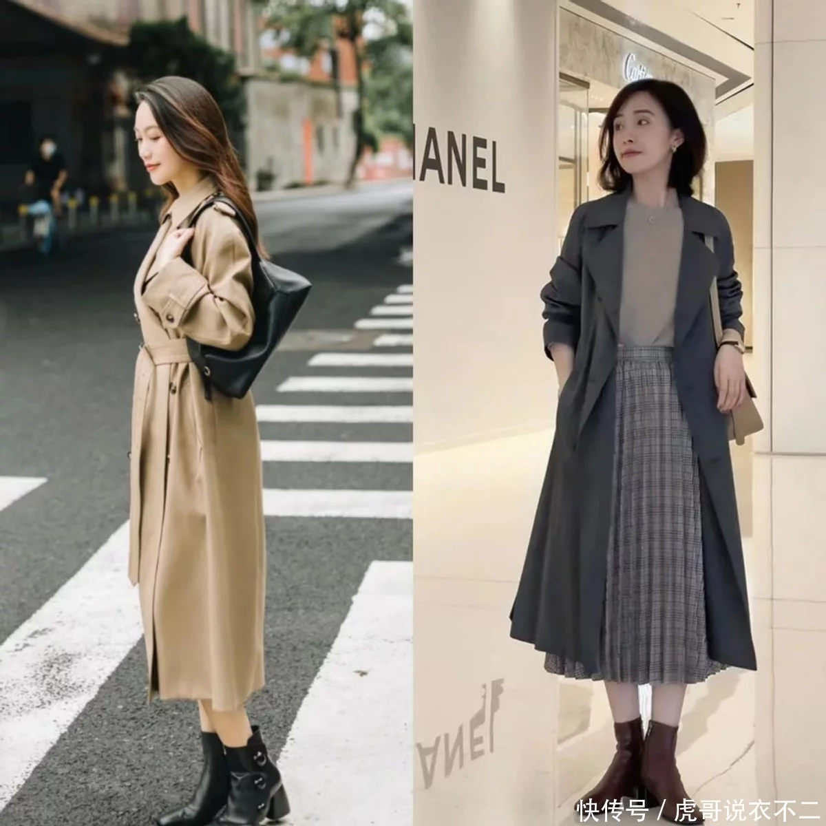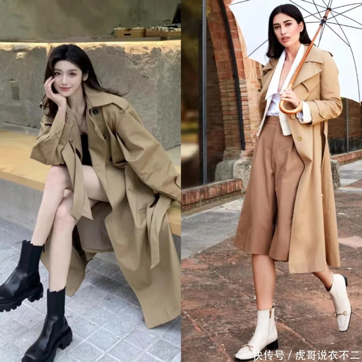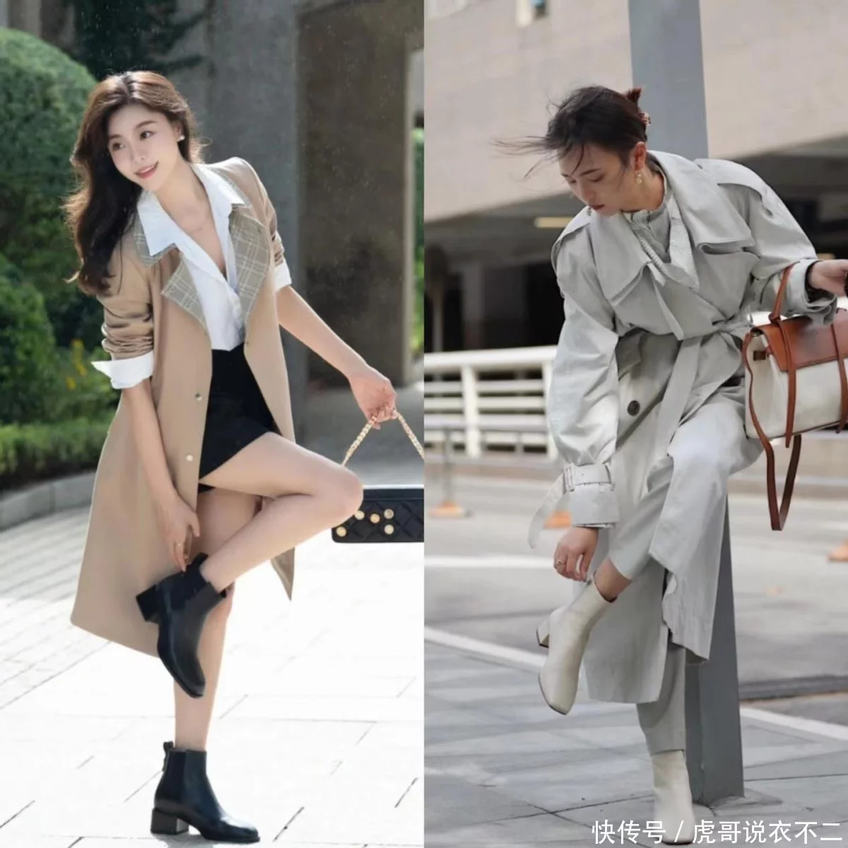 三、风衣+粗跟靴,露腿vs不露腿