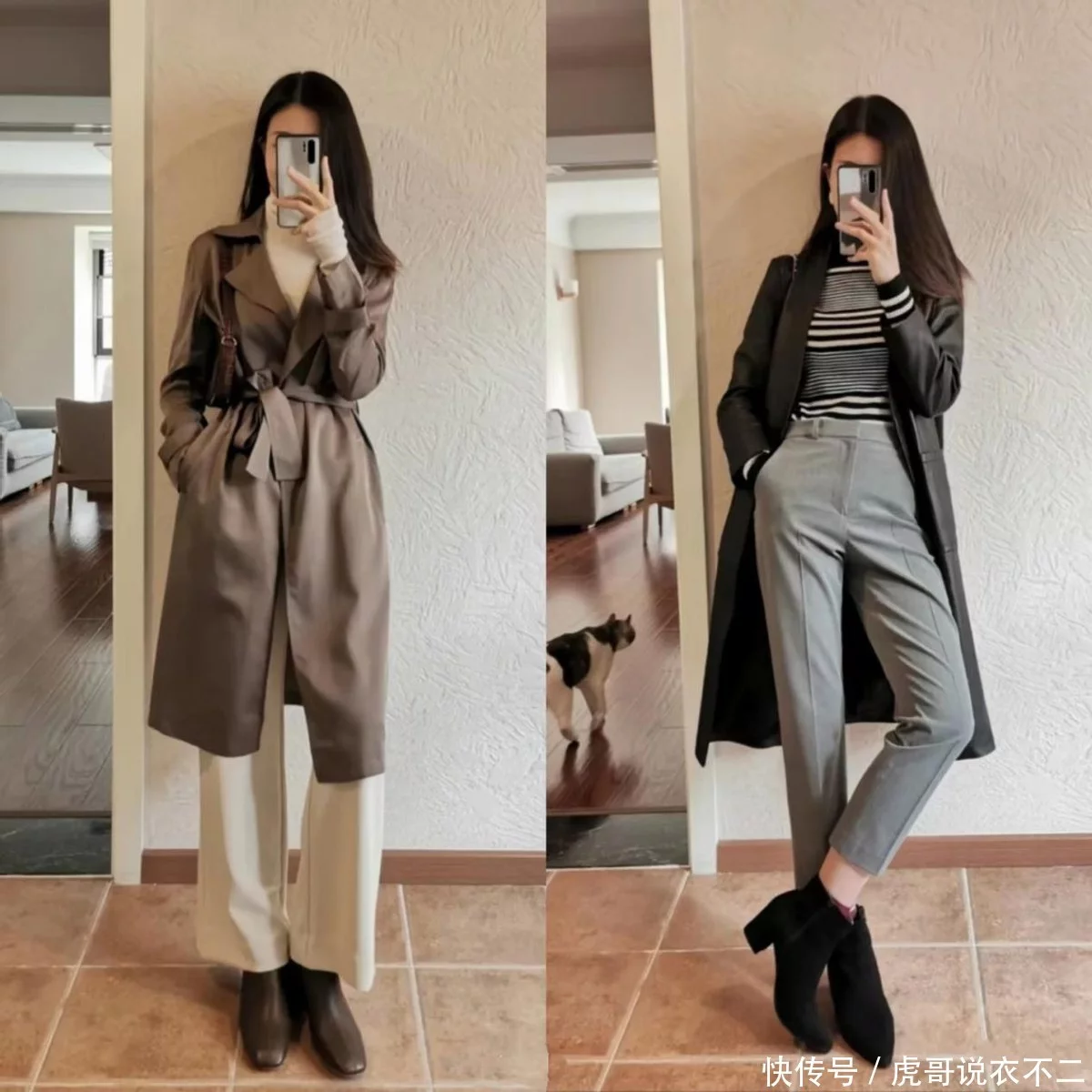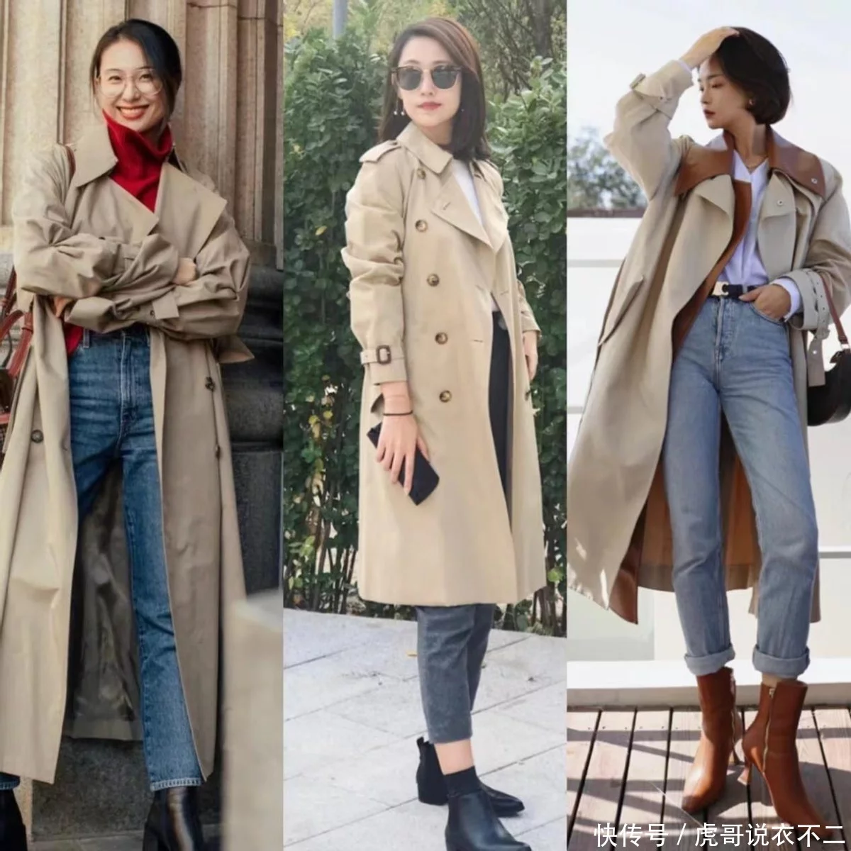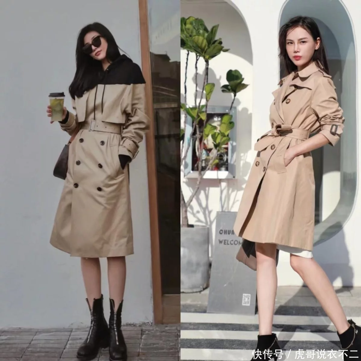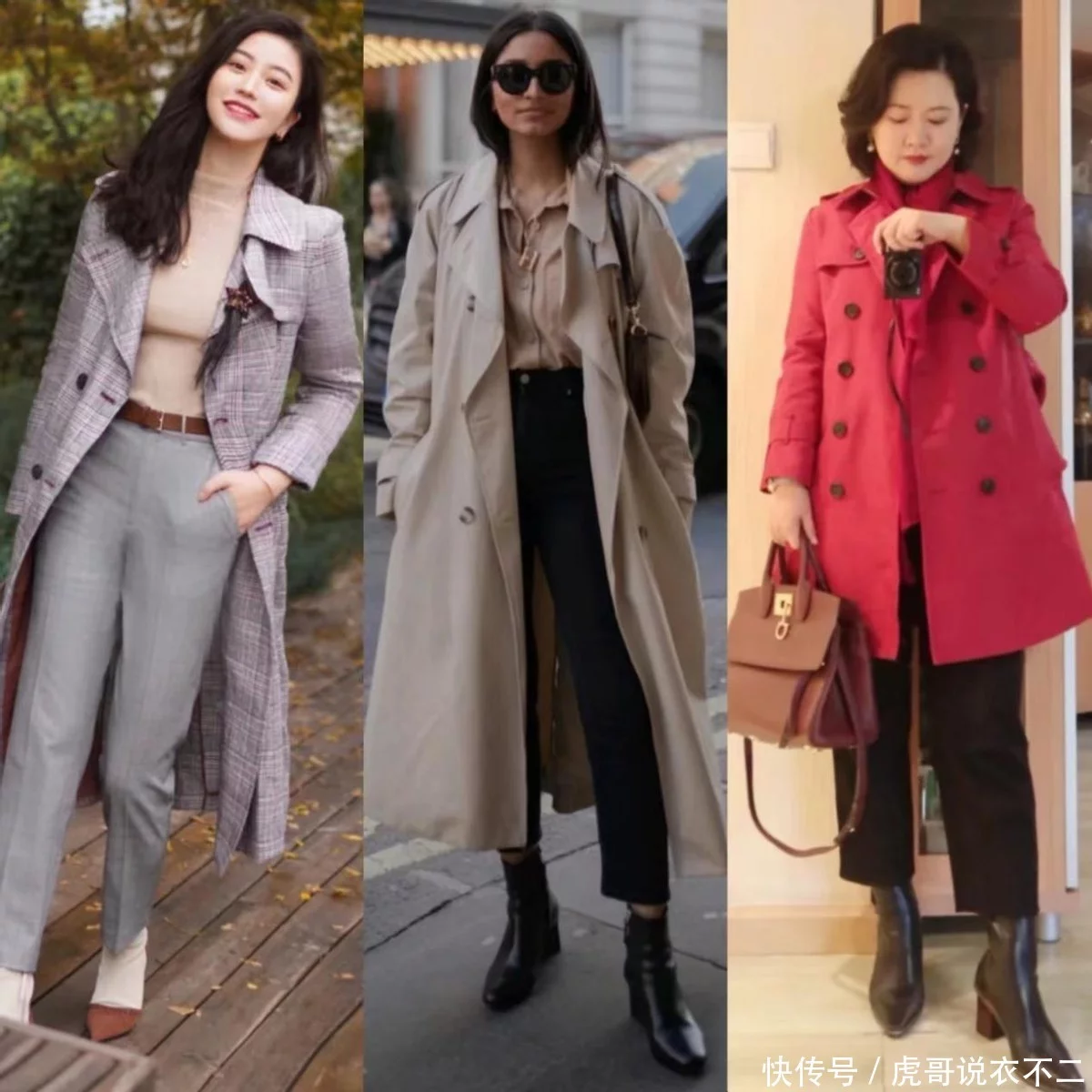 三、风衣+粗跟靴,露腿vs不露腿