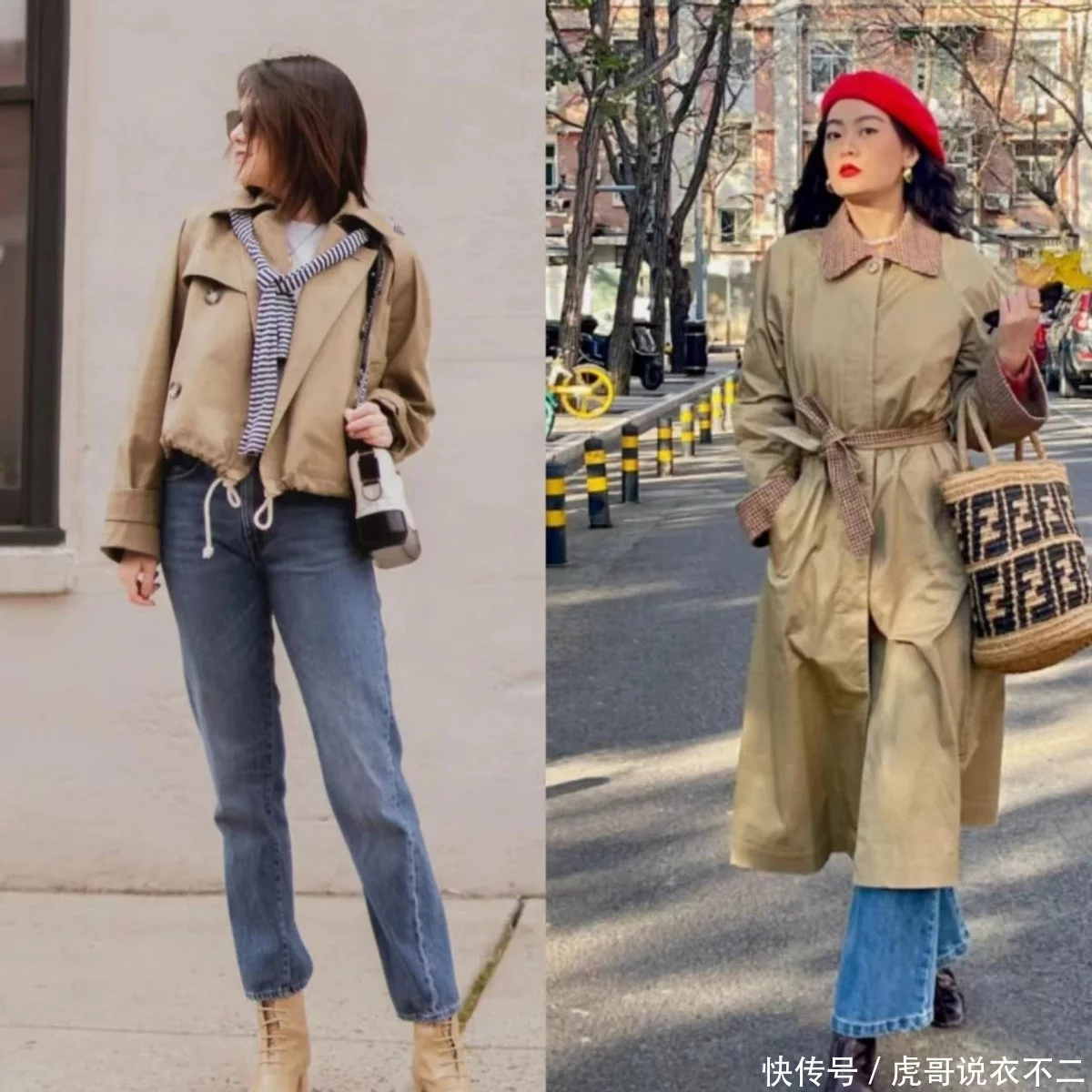 但采用这对组合,集美们需要注意风衣款式选择,尤其是风衣长度、版型与颜色。首先,风衣要么选短款,要么选在膝盖下方的长款。