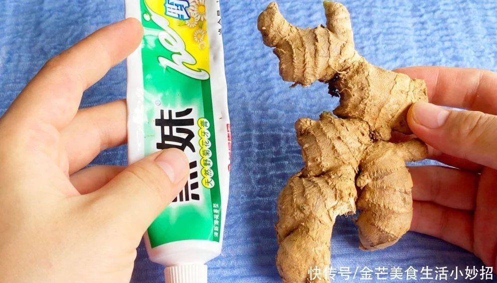 拿出来的生姜和牙膏,我们需要将它们处理一下。一般生姜表面都是比较脏的,我们要将它清洗干净,在清洗的时候可以放一些食用盐进去。