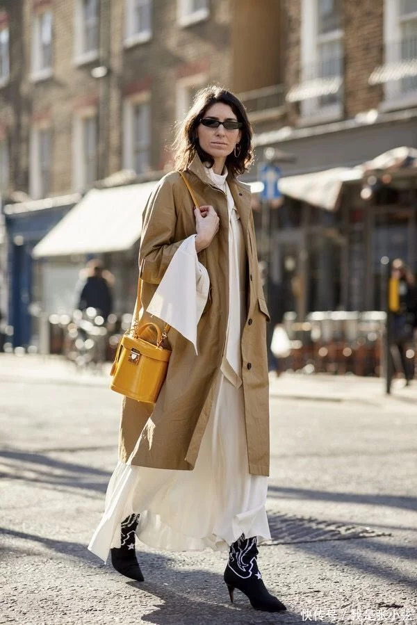 “内浅外深”的配色公式,也是很多时髦女性比较常用的穿法,米白色的连衣裙叠穿卡其色风衣,舒适又大方,而且显瘦效果也很不错。如果觉得造型过于单调的话,还可以搭配一件亮色系的配饰,比如姜黄色的水桶包,瞬间就可以成为点睛之笔,不高调也不浮夸,为造型加了不少时尚分。