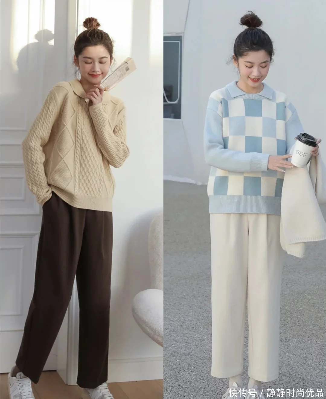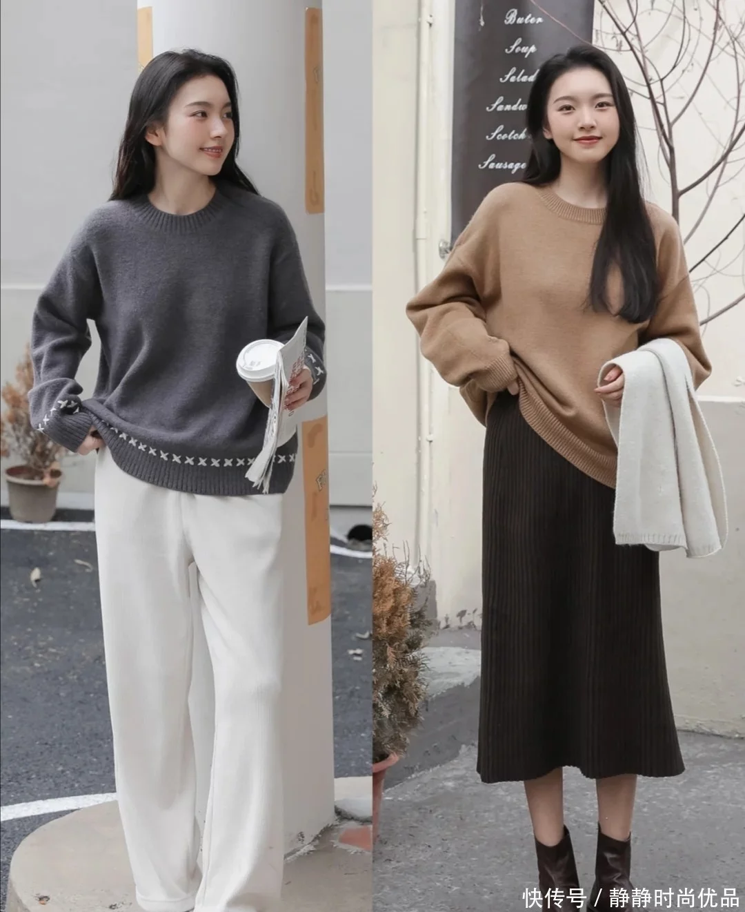 套头样式的针织毛衣,可以保持宽一点的轮廓或者是修身一点的裁剪,像这两款色彩常规的基础色毛衣,它们的款式构造不会紧紧地贴合曲线,方便女性打造出舒适的着装,配合白色裤装或者是很典型的黑色裙装,都能使得着装更完整。