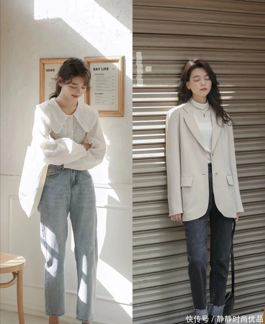 娃娃领衬衫,有了领口元素的加入,这类单品就不会具备严肃的气息,反而拥有弱化年龄的优势。结合蓝色牛仔裤,更加干净。
