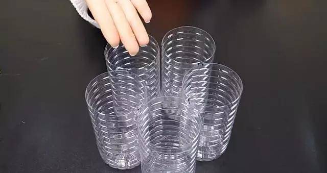 首先我们准备五个空塑料瓶,然后把每个塑料瓶的上半部分剪掉,剪掉之后呢用剪刀剪边,防止我们被刮伤,修剪后呢我们用热熔胶把五个塑料瓶圈起来,把五个塑料瓶修好。