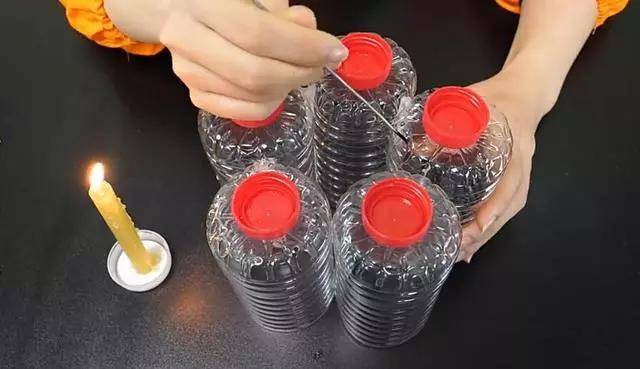 在瓶子底部用热熔胶固定了五个塑料瓶的盖子之后,嗯,用热铁棒把塑料瓶底部烧洞了,每个瓶子都要烫哦,热了以后呢,我们带他去厨房看看有什么用。