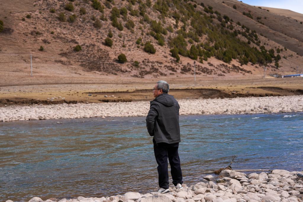 青海省水文水资源测报中心职工在子曲附近观察地形。新华社发