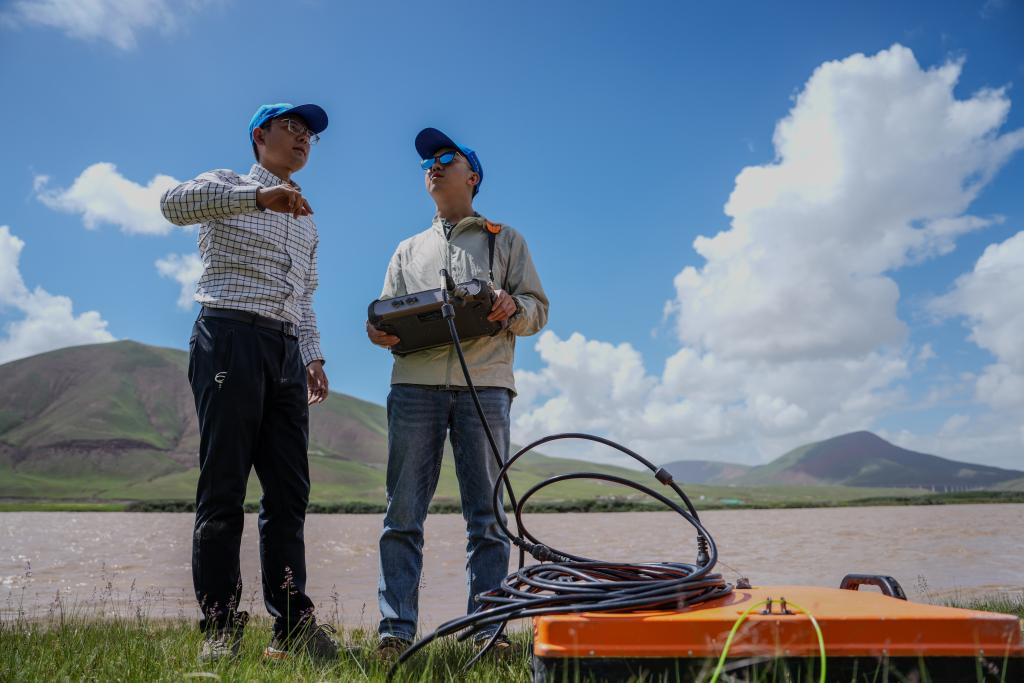 青海省玉树水文水资源测报分中心职工在香达水文站通过无人船测量水下断面。新华社发