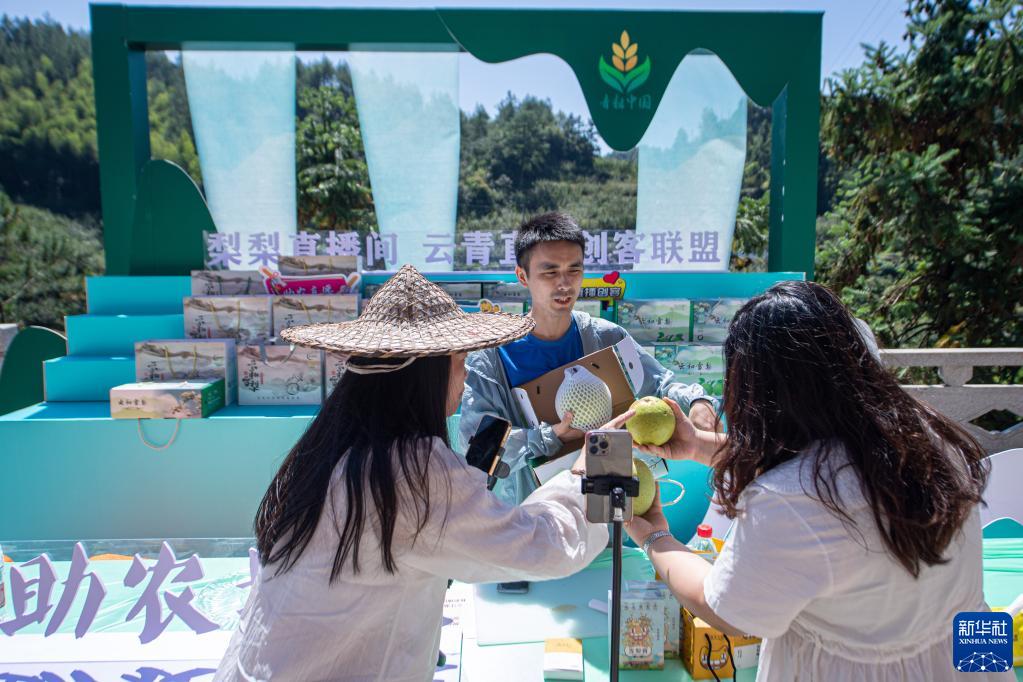 9月20日,主播在云和县元和街道梨庄村的梨园中直播销售云和雪梨。