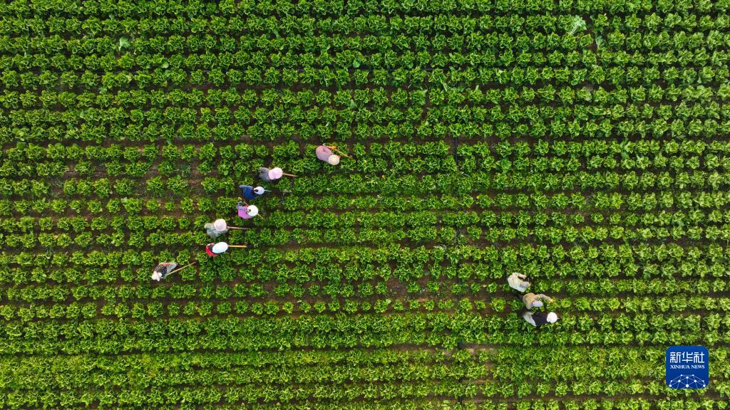 9月26日,河北省遵化市东新庄镇西庄村的农民在菜田劳作(无人机照片)。