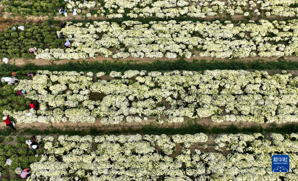 9月26日,在安徽省亳州市谯城区十八里镇蒋李村菊花种植基地,菊农在田间采收菊花(无人机照片)。