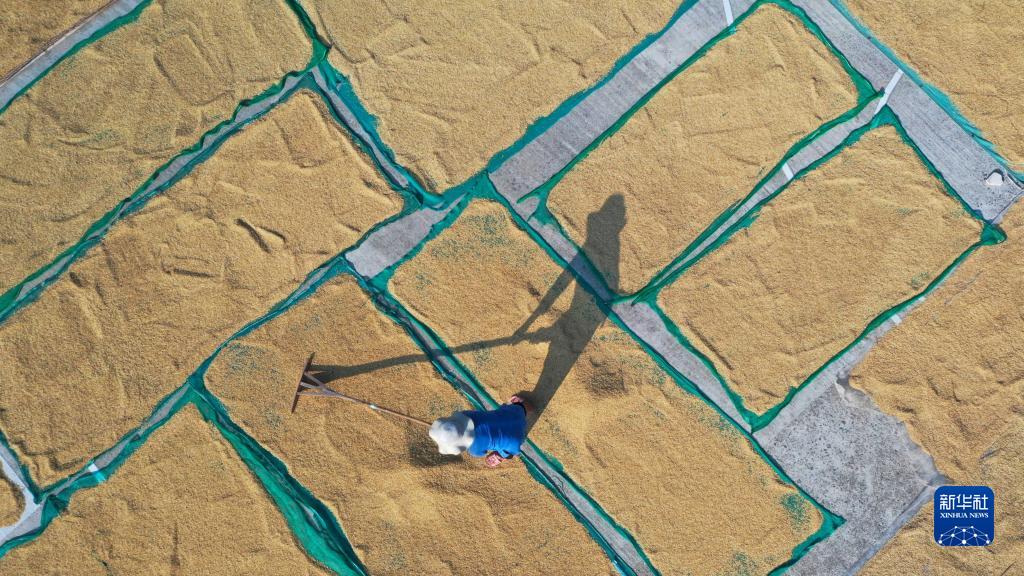9月26日,贵州省黔东南苗族侗族自治州剑河县革东镇光条村村民在晾晒稻谷(无人机照片)。