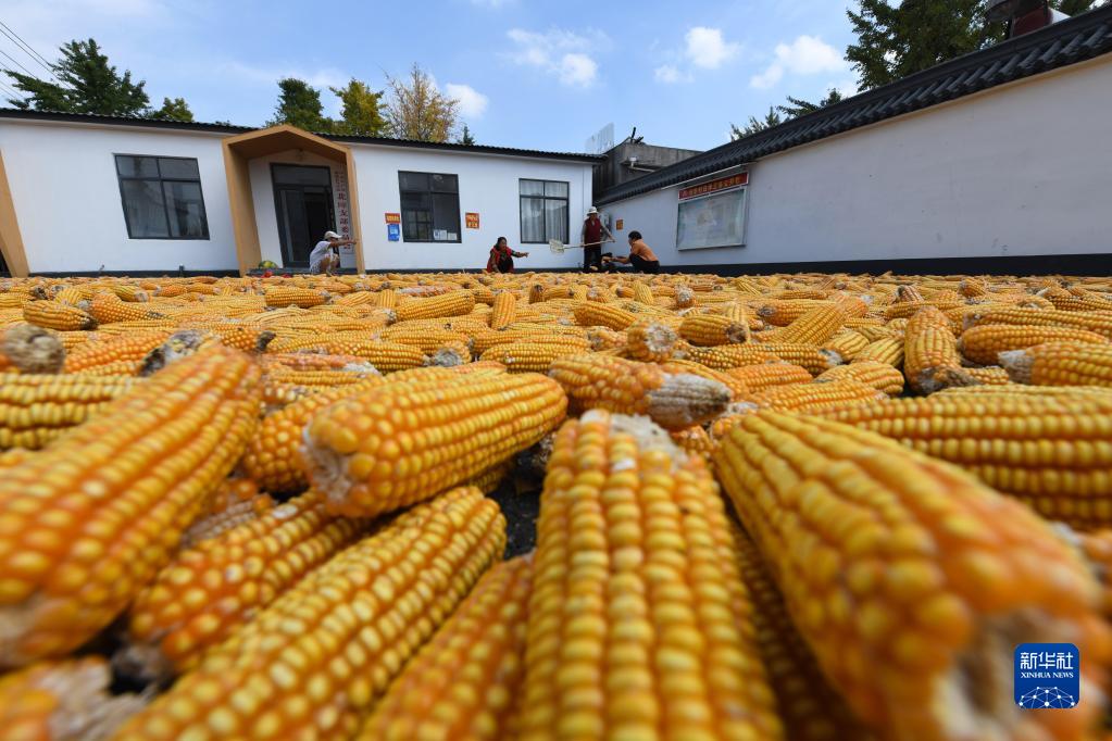 9月26日,山东省临沂市郯城县马头镇农民在晾晒玉米。