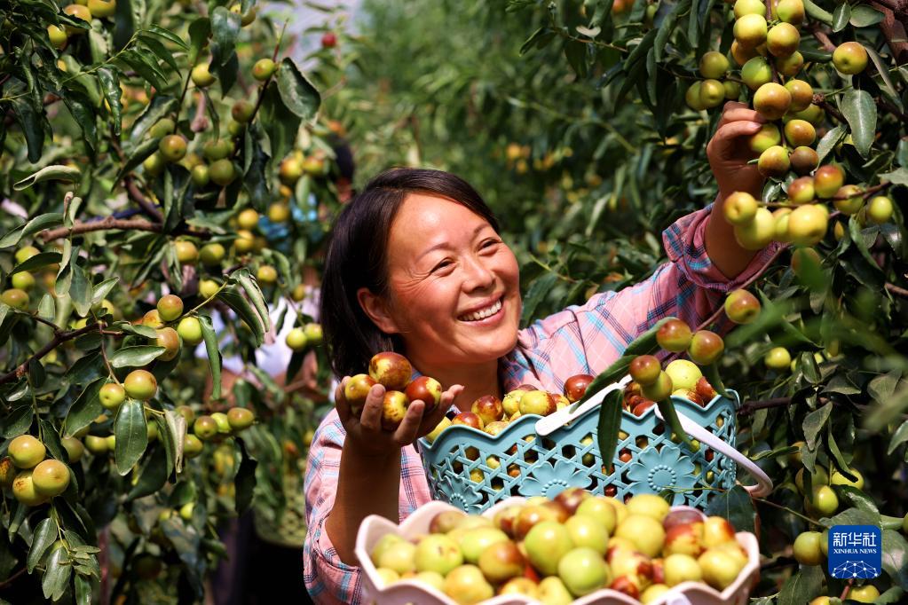 9月26日,在河南省驻马店市驿城区香山办事处扶贫产业基地天中生态园,农户采摘成熟的冬枣。
