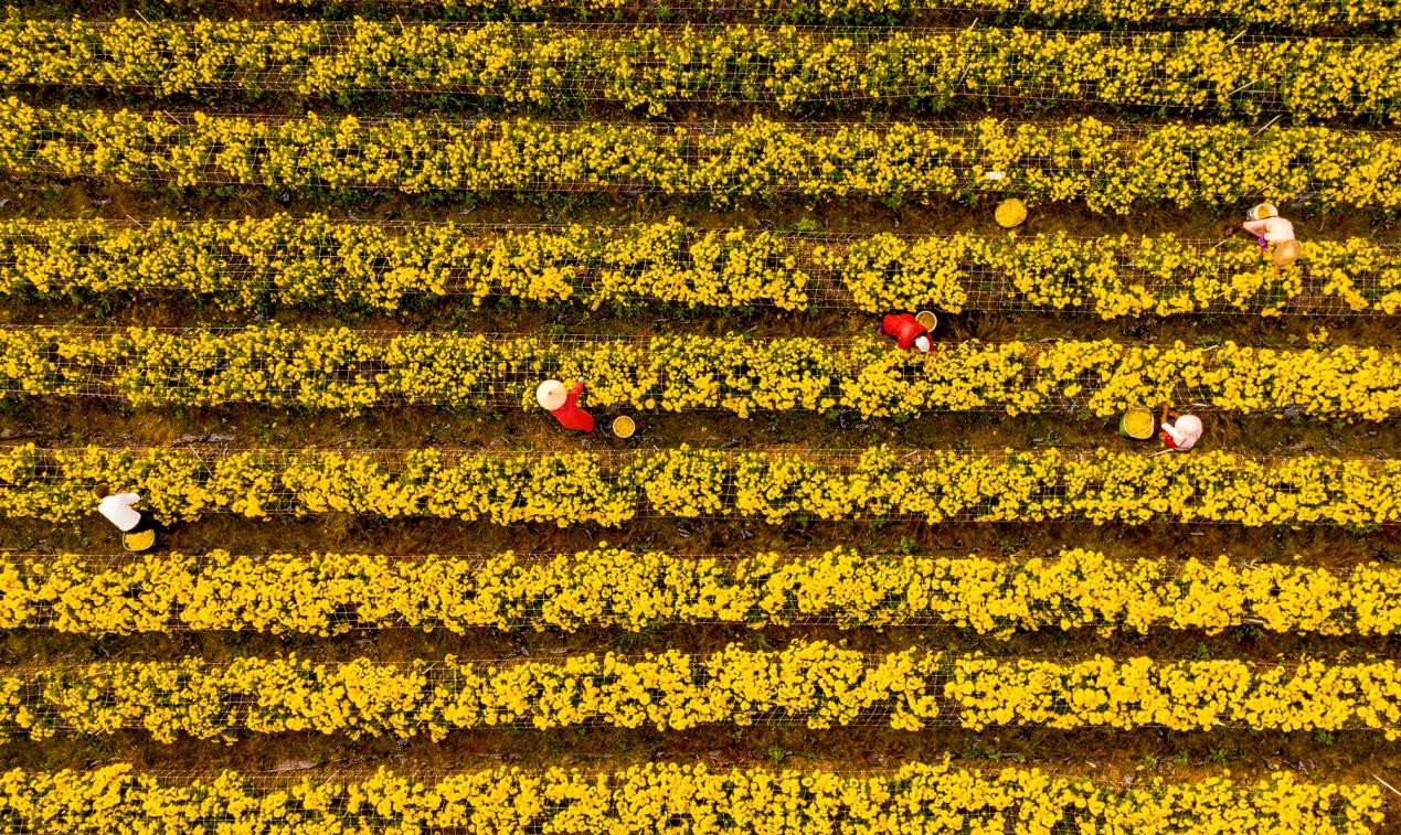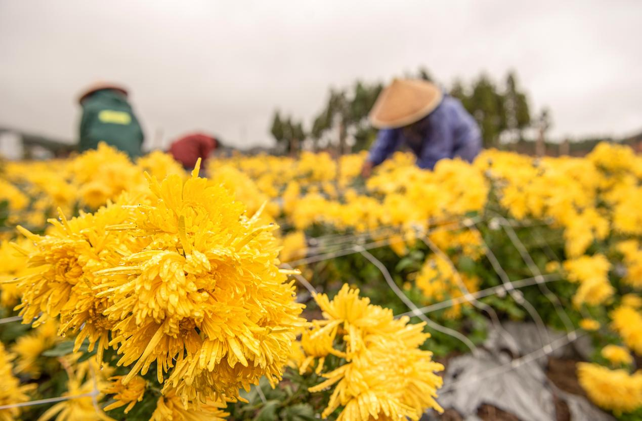 近期,浙江省温州市文成县二源镇湖田村的田园里,成片的金丝皇菊竞相开放,花香沁人心脾,村民忙碌地采摘着。