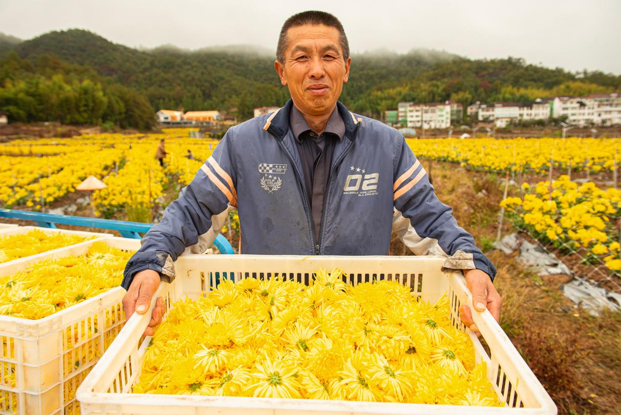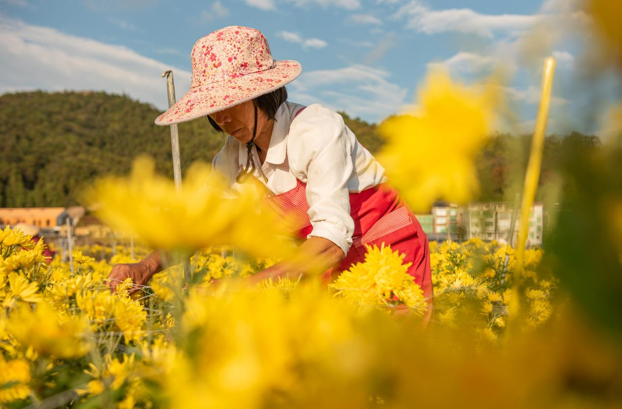 经过精挑细选的金丝皇菊被村民们小心翼翼地放入筐中,一朵朵菊花,不仅是游客们赏景拍照的心头好,也是当地村民钱袋子鼓起来的希望。