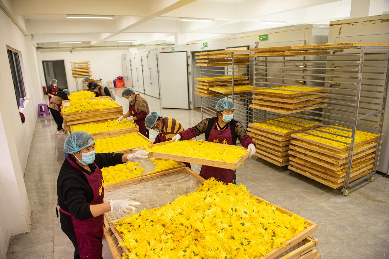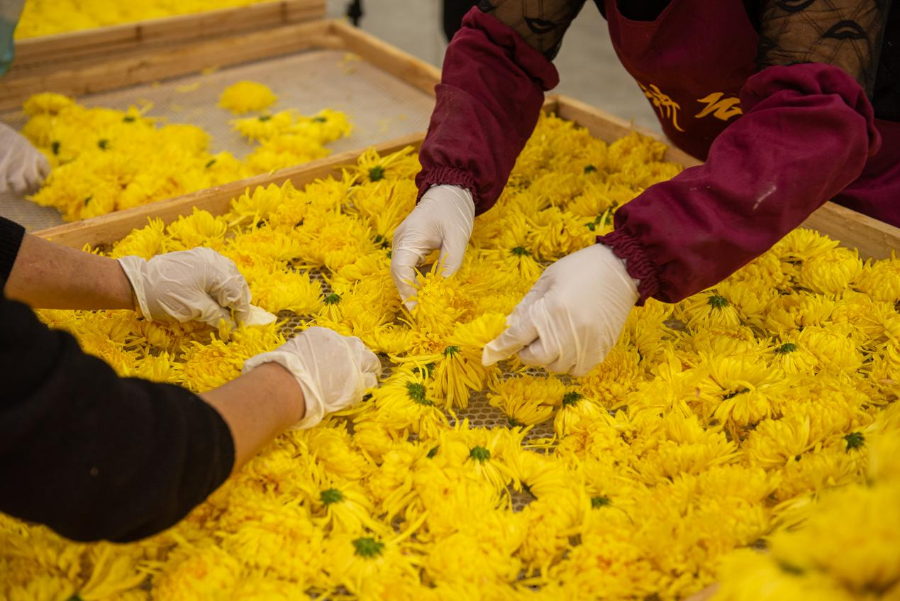 在“共富工坊”“红色车间”里,工坊职工正进行金丝黄菊烘干前的准备,他们需要对已经初分的金丝黄菊进行再次分拣,只有经过初分-再分拣-铺平摆放工序的金丝黄菊,才会被送进烘干房烘制。