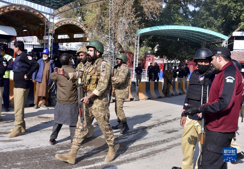 1月30日,在巴基斯坦西北部开伯尔-普什图省首府白沙瓦市,安全人员在爆炸袭击事件现场附近警戒。
