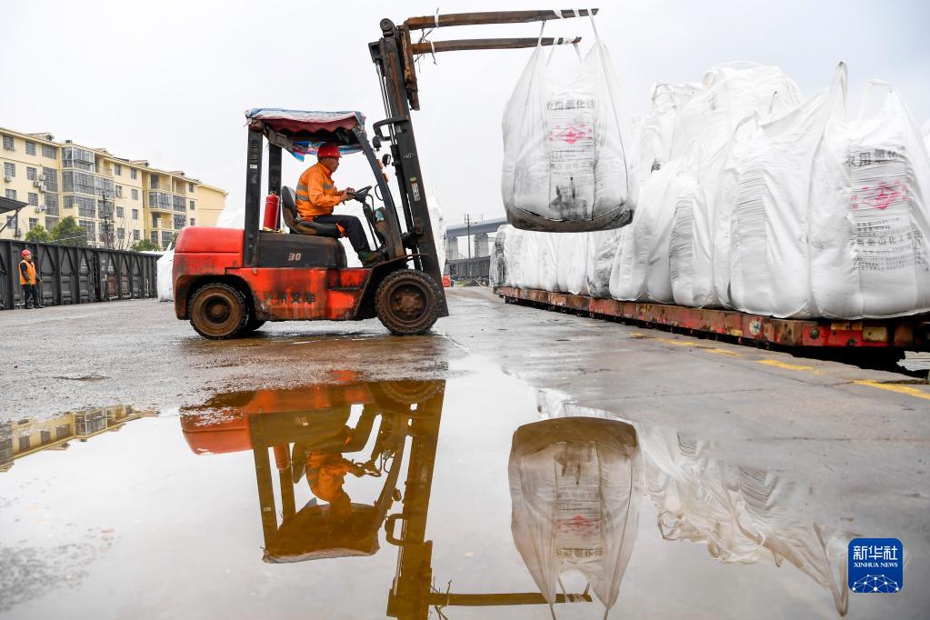 2月7日,江西省宜春西火车站的工作人员在装卸化肥。