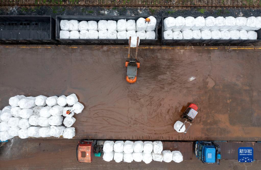 2月7日,江西省宜春西火车站的工作人员在装卸化肥(无人机照片)。