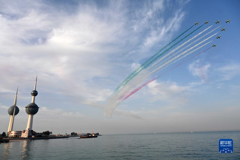 2月25日,沙特空军“沙特之鹰”飞行表演队在科威特首都省进行飞行表演。