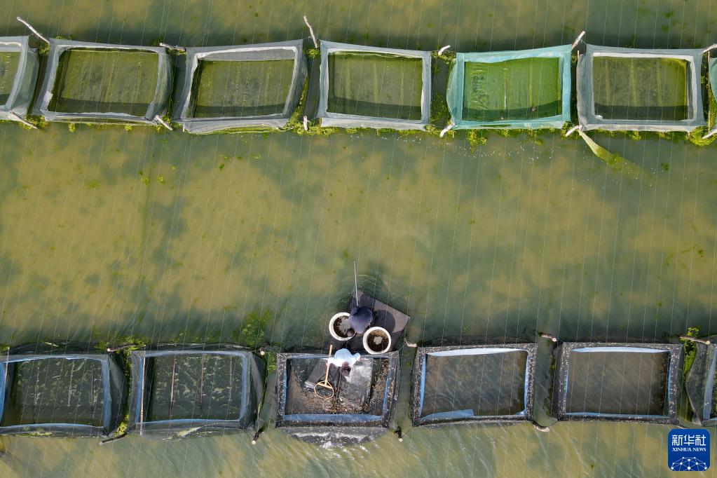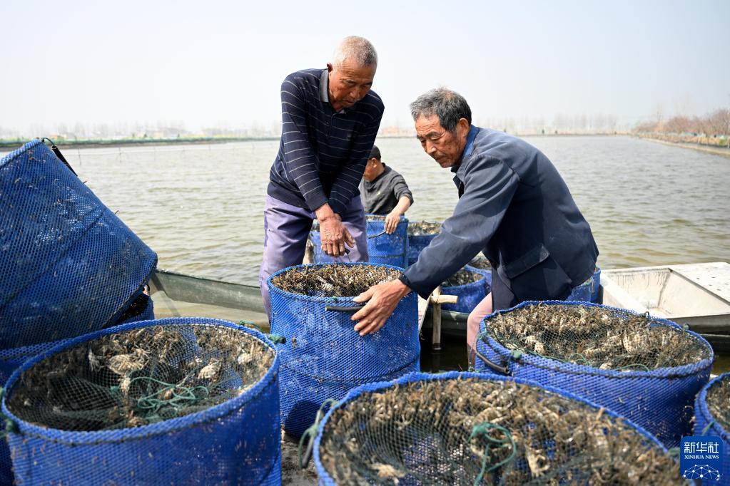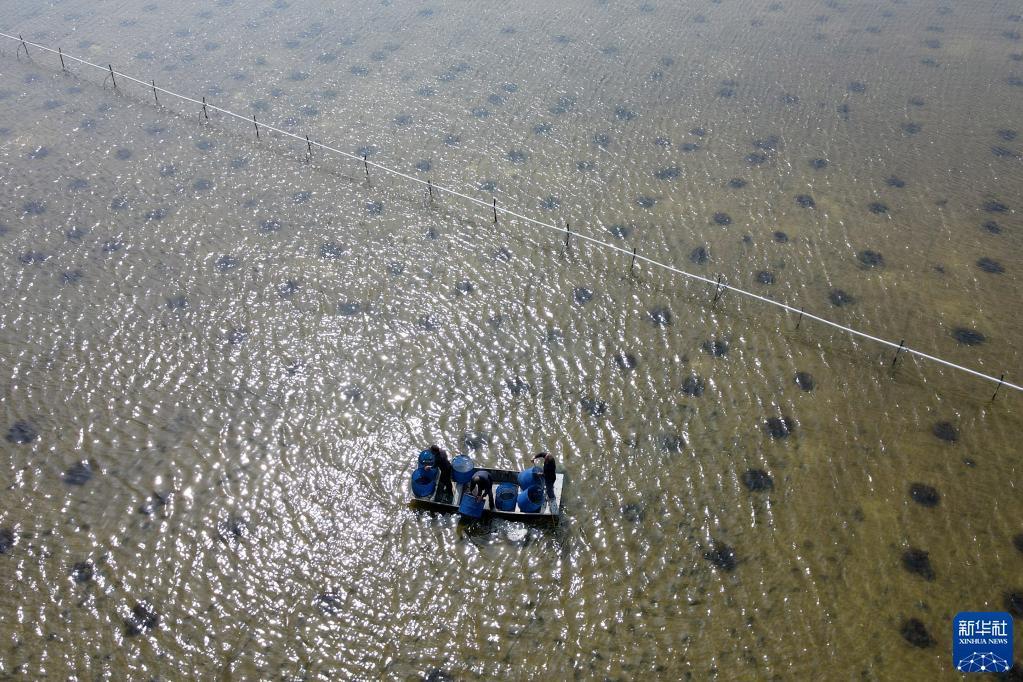 3月9日,在安徽省蚌埠市五河县申集镇,蟹农从网箱中捞出培育好的蟹苗(无人机照片)。