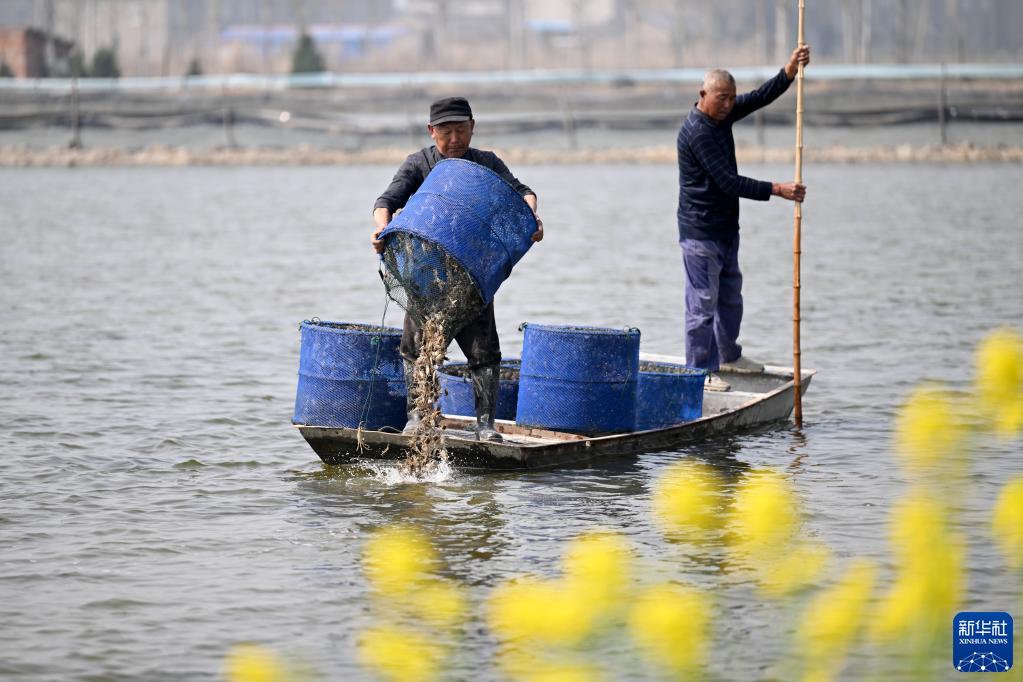 3月9日,在安徽省蚌埠市五河县小圩镇,蟹农在投放蟹苗。