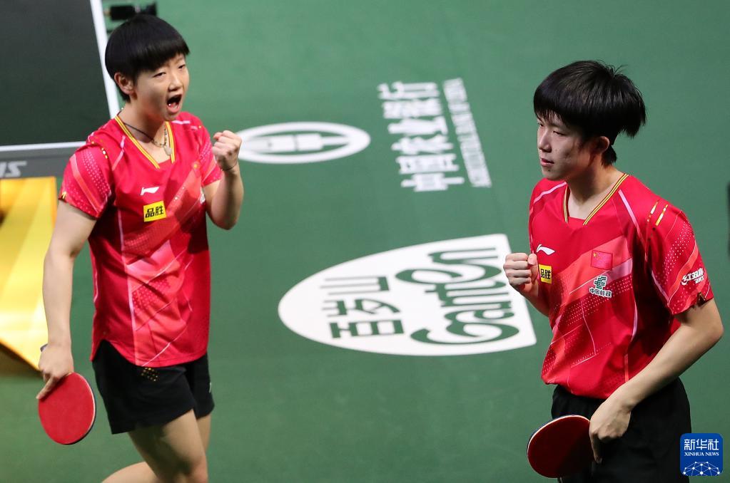 5月26日,王楚钦(右)/孙颖莎在比赛中庆祝。新华社记者 王东震 摄