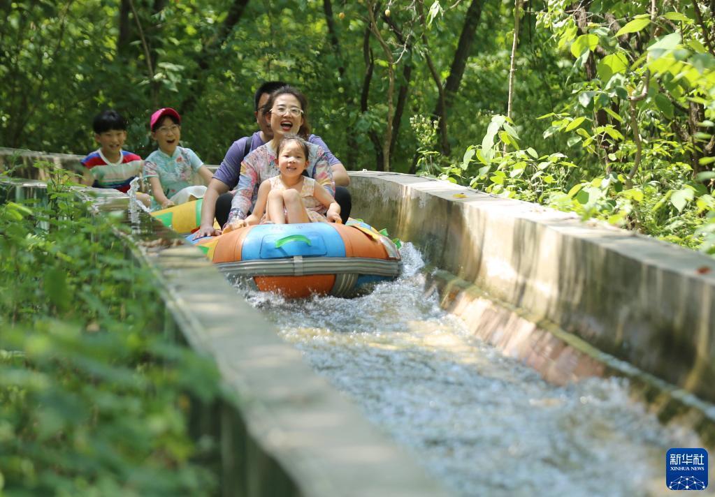 6月23日,游客在山东省沂南县铜井镇竹泉村体验丛林漂流。