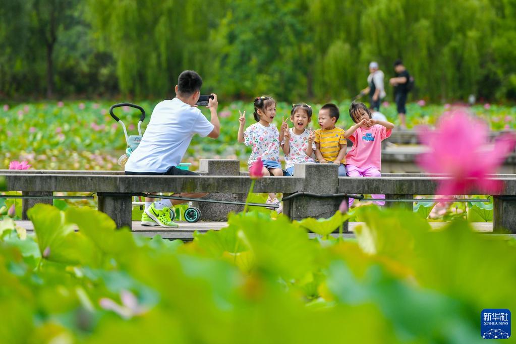 6月23日,小朋友在浙江省湖州市长兴县仙山湖景区拍照留念。