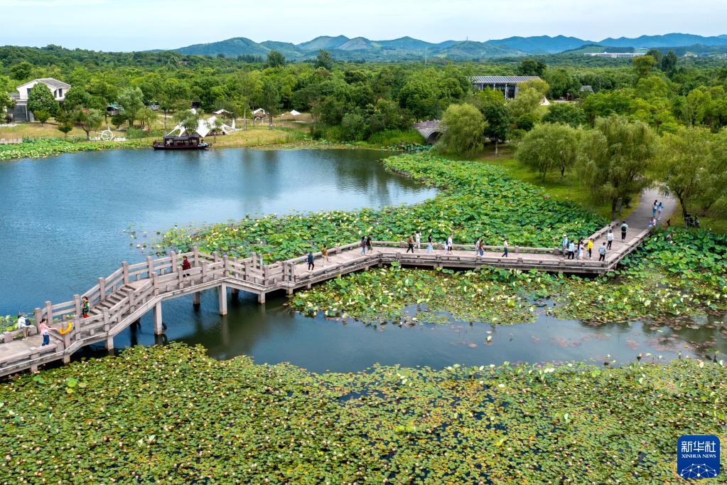 6月23日,游客在浙江省湖州市长兴县仙山湖景区赏荷观景(无人机照片)。