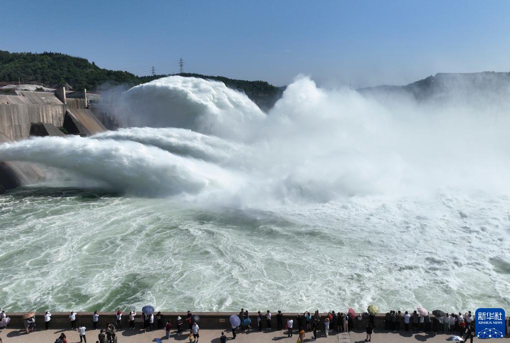 6月23日,游客在黄河小浪底水利枢纽工程出水口观看调水调沙(无人机照片)。