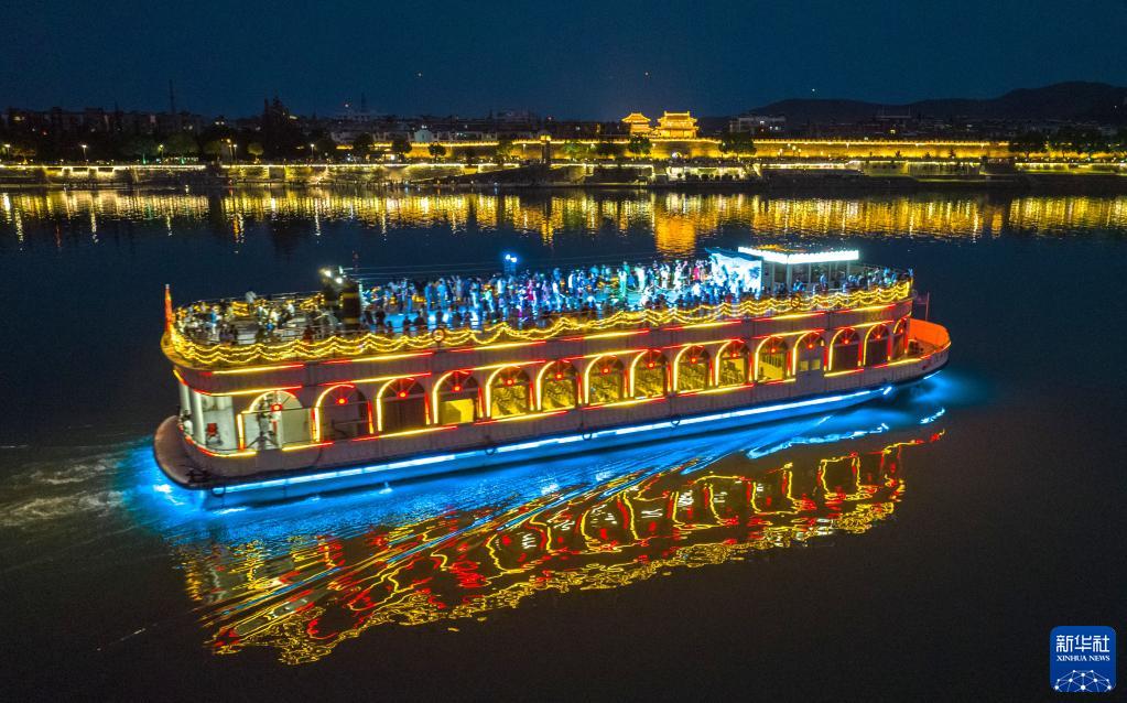 6月22日晚,游人乘坐汉江游轮欣赏湖北襄阳古城夜景(无人机照片)。