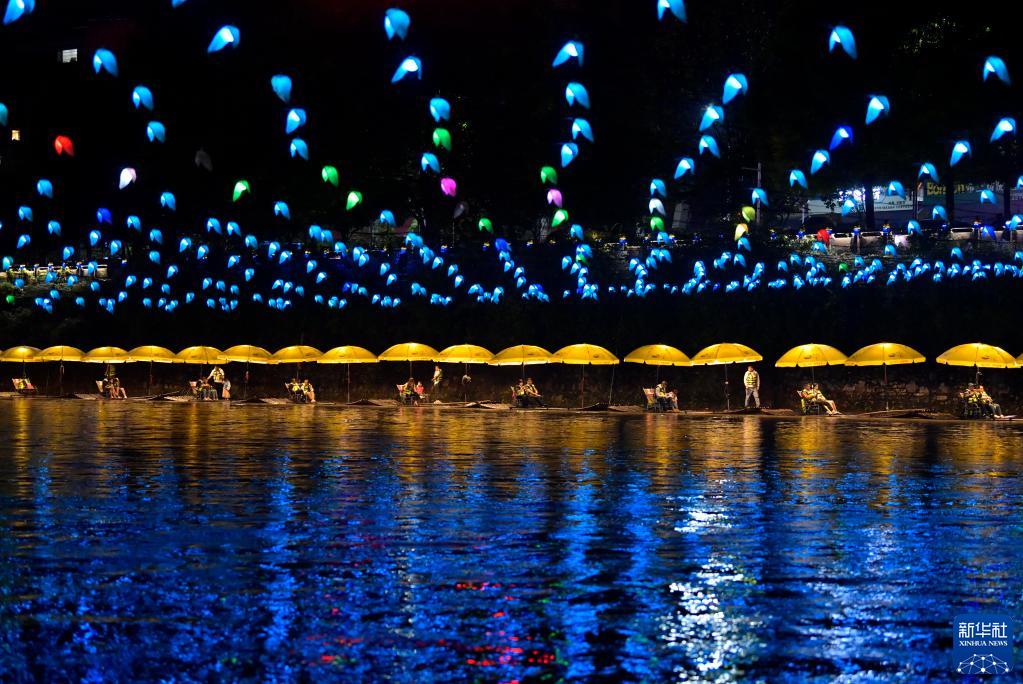 6月22日晚,游客在湖北省宣恩县城贡水河上乘坐竹筏赏夜景。