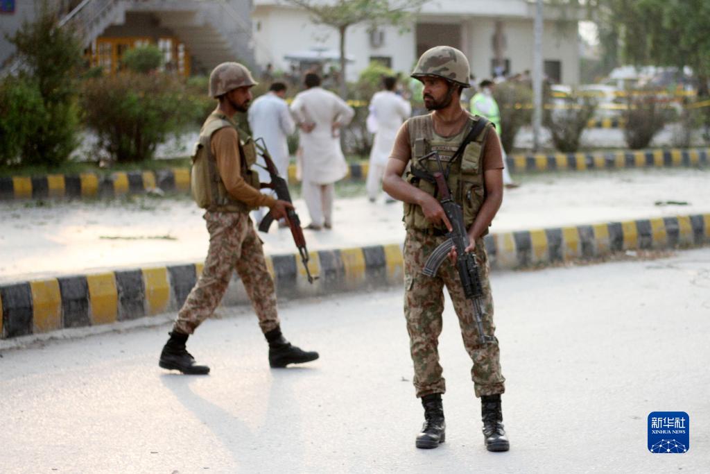 7月18日,安全人员在巴基斯坦白沙瓦市的爆炸事件现场附近警戒。