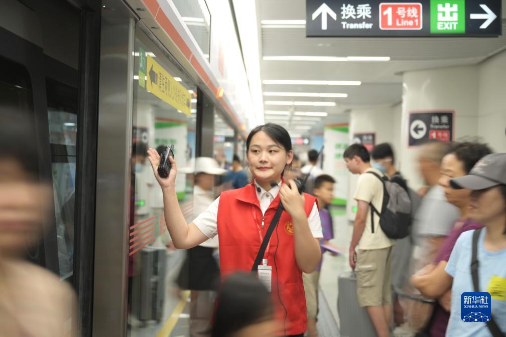 8月27日,工作人员在福州东街口站1号线与4号环线换乘处值班。