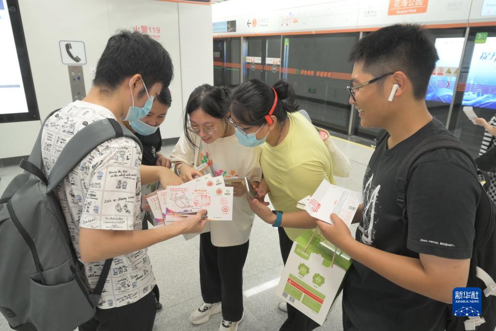 8月27日,乘客在地铁花海公园站翻看4号环线首通段载客运营首日封。