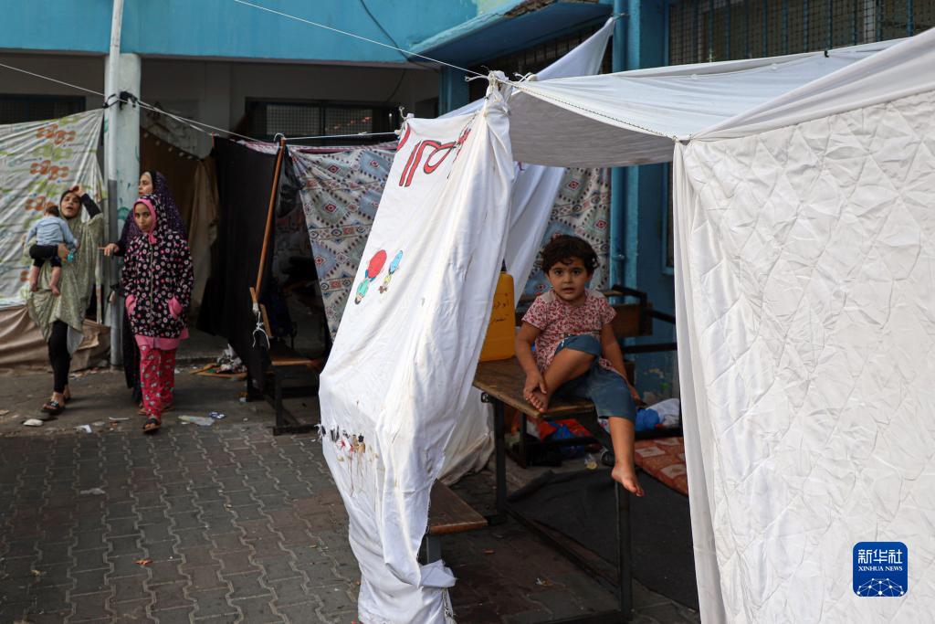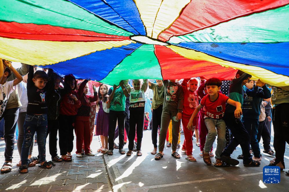 10月23日,在加沙地带南部,流离失所的儿童在联合国近东巴勒斯坦难民救济和工程处一所附属学校内做游戏。