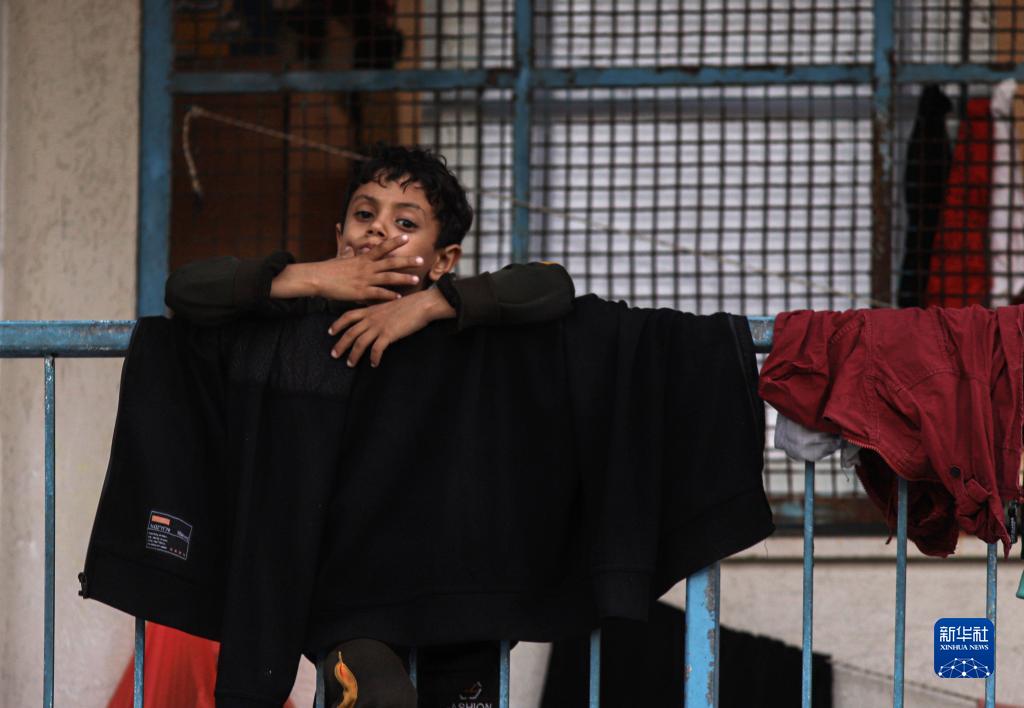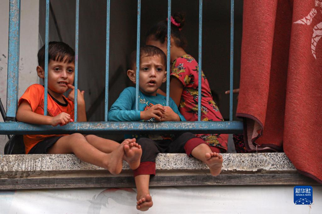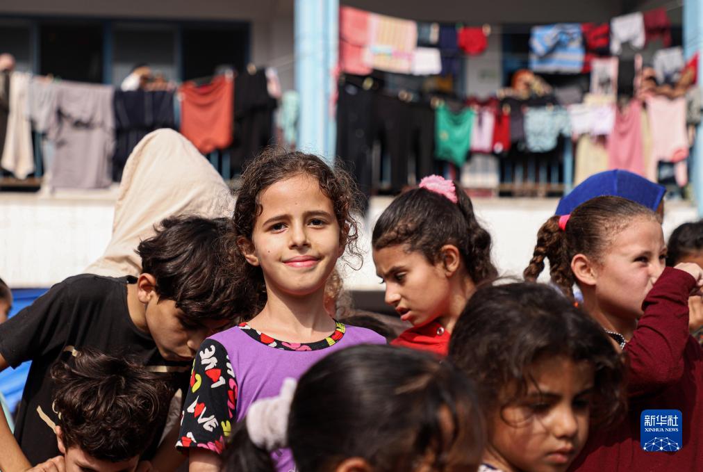 这是10月23日在加沙地带南部联合国近东巴勒斯坦难民救济和工程处一所附属学校内拍摄的流离失所的儿童。