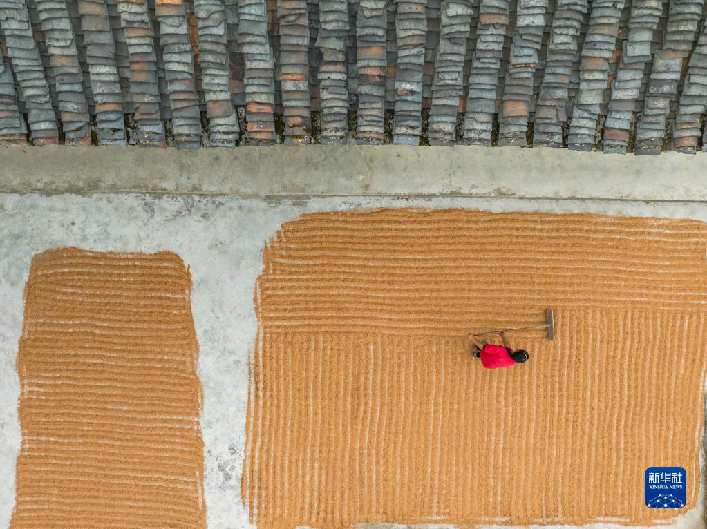 9月1日,贵州省黔西市中建乡中广村村民在晾晒粮食(无人机照片)。