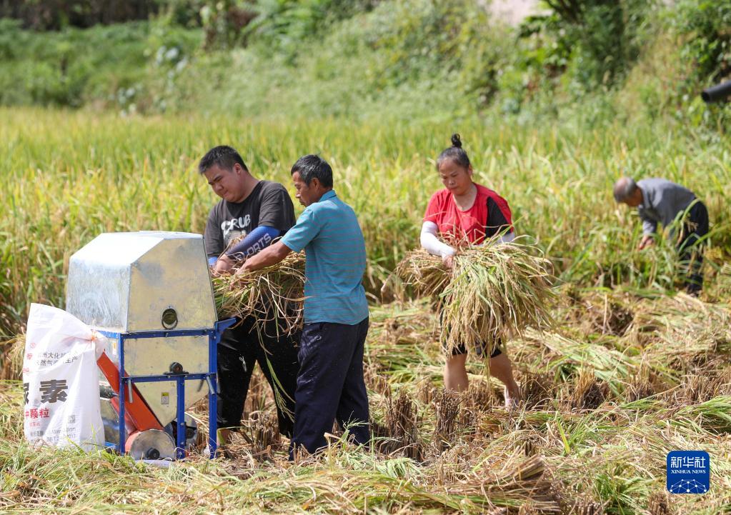 9月1日,在贵州省铜仁市玉屏侗族自治县新店镇新店村,村民在收获水稻。
